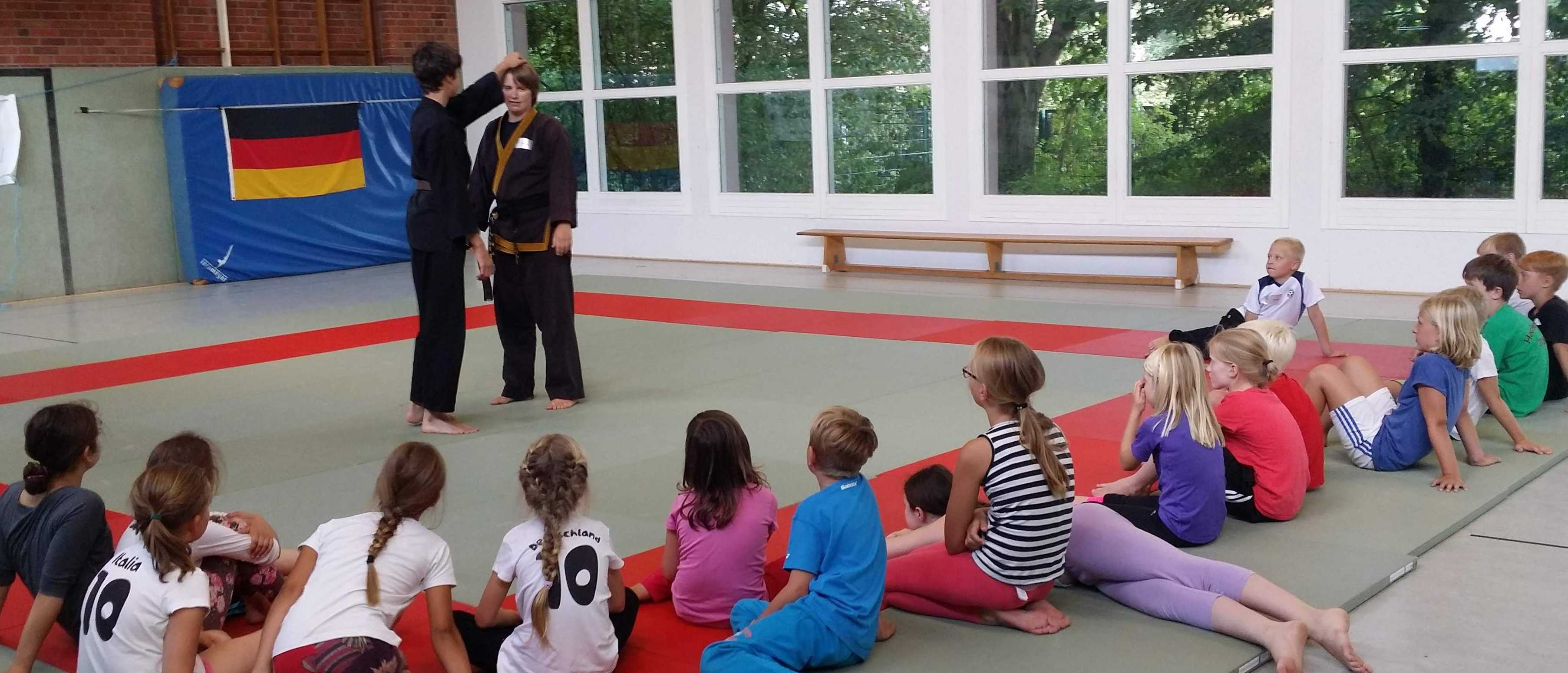 Um auf die Ansprüche und Fähigkeiten der unterschiedlichen Altersklassen besser eingehen zu können, wurden die Teilnehmer in Gruppen unterteilt. Des Weiteren konnte den Ferienkindern, welche nach außen hin alle viel Freude am spielerischen Heranführen an die Kampfkunst Hapkido hatten, ein Ausblick auf fortgeschrittene Bereiche gegeben werden. Die Trainer, unterstützt von Steffen Bisping, demonstrierten zu verschiedenen Selbstverteidigungssituationen die entsprechenden Abwehrtechniken, die teilweise anschließend von den Kindern geübt wurden. Während der Pausen standen den Teilnehmern vom Verein gespendete Getränke und Snacks zur Stärkung bereit.