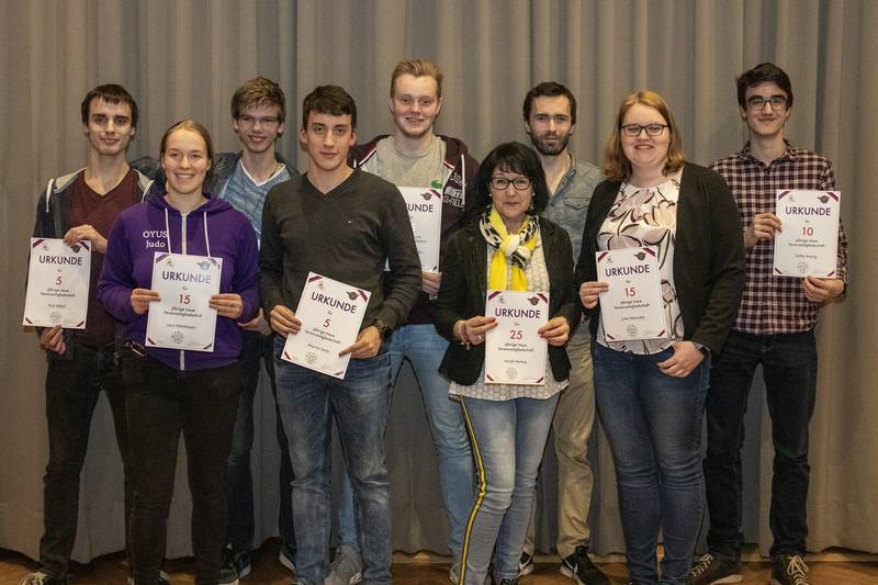 Für langjährige treue Vereinsmitgliedschaft erhielten einige der Anwesenden eine Urkunde (v.l.n.r.): Rudi Umlauf, Lena Haferkemper, Philip Preißler, Maurice Gerke, Hendrik Peternathe, Ara Hertwig, Julian Müller, Jana Peternathe und Steffen Bisping.