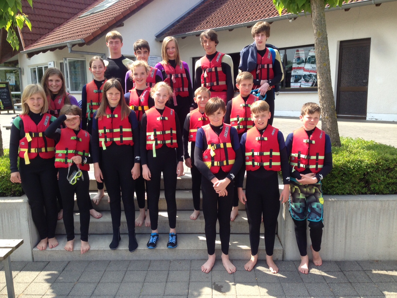 Trotz des eher durchwachsenen Wetters zeigten viele Teilnehmer ihre große Affinität zum kühlen Nass, da der Großteil bereits vor dem ersten Start im Wasser zu finden war. Durch die Ausleihe von Neoprenanzügen für alle Teilnehmer wurde die Wassertemperatur kompensiert. Nach einer kurzen Einführung durch den Bahnbetreiber, ging es dann endlich um kurz nach 12 Uhr auch auf die Wasserskier. Schon nach den ersten Starts war zu erkennen, dass sehr Viele nicht zum ersten Mal auf Skiern standen, sondern stattdessen, als wäre dieses selbstverständlich, eine große Anzahl von drehten. Neben den Standard-Wasserskiern erfreuten sich auch Knee-Boards, mit denen man zu zweit fahren konnte, Wakeboards und sogenannte „Teller“, die einfach nur aus einer runden Holzscheibe bestanden, großer Beliebtheit. Die Nutzung dieser vielen Geräte forderte den Kindern und Jugendlichen hohe koordinative Fähigkeiten ab, von denen so mancher Elternteil auch sehr überrascht schien, was die eigenen Kinder so alles leisten können. Nach anstrengenden zwei Stunden auf dem See, auf dem zwischendurch sogar hin und wieder die Sonne durchschien, wurde der Grill in der anliegenden Grillhütte angefeuert, um die erschöpften Sportler wieder ein wenig zu stärken.